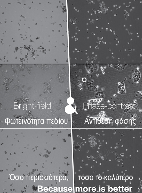 Το οπτικό σύστημα του sediMAX con TRUST έχει την δυνατότητα λήψης εικόνων μικροσκόπησης τόσο φωτεινού πεδίου όσο και φάσης αντίθεσης για τη λήψη περισσότερων πληροφοριών σχετικά με τα σωματίδια του δείγματος.