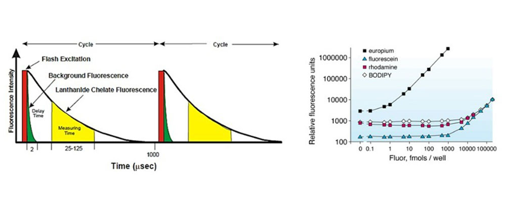 Στη μέθοδο TRF (Time Resolved Fluorescence), η πηγή φωτός δεν εκπέμπει συνεχή ακτινοβολία φωτός, αλλά αναλαμπές φωτός (κόκκινη ράβδος). Δεδομένου ότι το χρωμογόνο ( χηλικές ενώσεις ευρωπίου ) έχει ορισμένη αδράνεια, εξακολουθεί να εκπέμπει φθορισμό για σύντομο χρονικό διάστημα μετά την αναλαμπή του φωτός (μαύρη γραμμή στην εικόνα), καθώς και τυχόν φθορισμό υποβάθρου (πράσινη περιοχή στην εικόνα). Το σύστημα ανιχνεύει μόνο τον υπολειπόμενο φθορισμό μεταξύ της μίας αναλαμπής του φωτός και της επομένης (κίτρινη περιοχή στην εικόνα), όπου δεν υπάρχει ούτε άμεσο φως από την πηγή ούτε φως από την ακτινοβολία υποβάθρου.