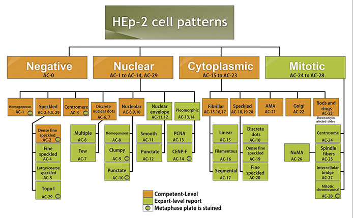 Η ονοματολογία και το δέντρο ταξινόμησης για όλα τα μοτίβα των κυττάρων HEp-2 όπως εμφανίζονται στη διεύθυνση www.ANApatterns.org εμφανίζονται παρακάτω.