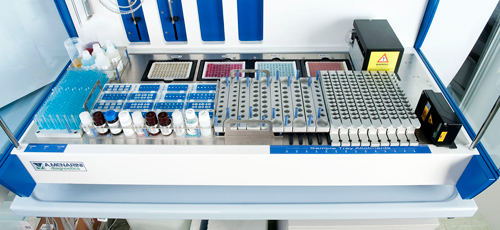 Πλήρως αυτοματοποιημένος αναλυτής για μεθόδους ELISA και IFA. Ο αναλυτής μπορεί να διαχειριστεί 4 μικροπλάκες ELISA και 16 πλακίδια IFA ταυτόχρονα στην ίδια ρουτίνα. Μπορεί να τρέξει έως και 10 εξετάσεις τη φορά